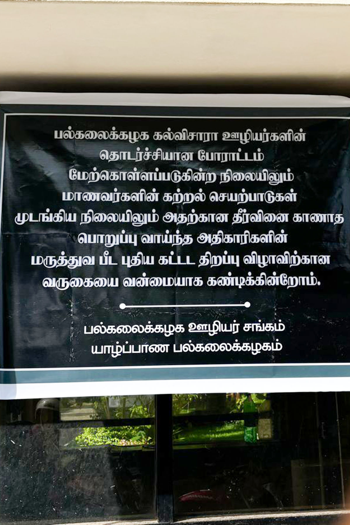 யாழ். பல்கலைக்கழக மருத்துவ பீட கட்டடமொன்றைத் திறந்து வைப்பதற்காக யாழ்ப்பாணத்துக்கு வருகைதந்த ஜனாதிபதி ரணில் விக்கிரமசிங்கவுக்கு எதிராகவே பல்கலைக்கழக ஊழியர் சங்கத்தினரால் பல்கலைக்கழக வளாகத்தில் இந்த போராட்டம் முன்னெடுக்கப்பட்டது.