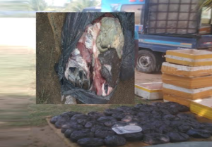 இவர்களிடம் இருந்து 82 கிலோ கடலாமை இறைச்சி பொதி செய்யப்பட்ட நிலையில் மீட்கப்பட்டுள்ளது.