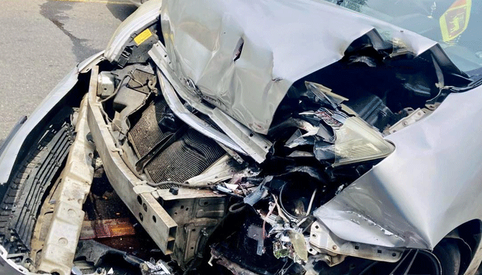 விபத்தின் போது காரின் முற்பகுதி முற்றாகச் சேதமடைந்துள்ளது.