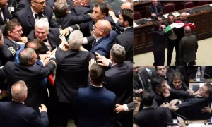 இந்த சூழ்நிலையில் இத்தாலி பாராளுமன்றத்தில் எம்.பிக்களிடையே கைகலப்பு ஏற்பட்ட சம்பவம் பரபரப்பை கிளப்பியுள்ளது. நேற்று முன் தினம் [ஜூன் 12] இத்தாலி பாராளுன்ற கீழ் சபையில் இத்தாலியில் உள்ள பிராந்தியங்களுக்கு அதிக சுயாட்சி அளிக்கும் மசோதா மீதான வாக்கெடுப்பு நடத்தப்பட்டது.