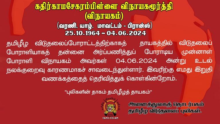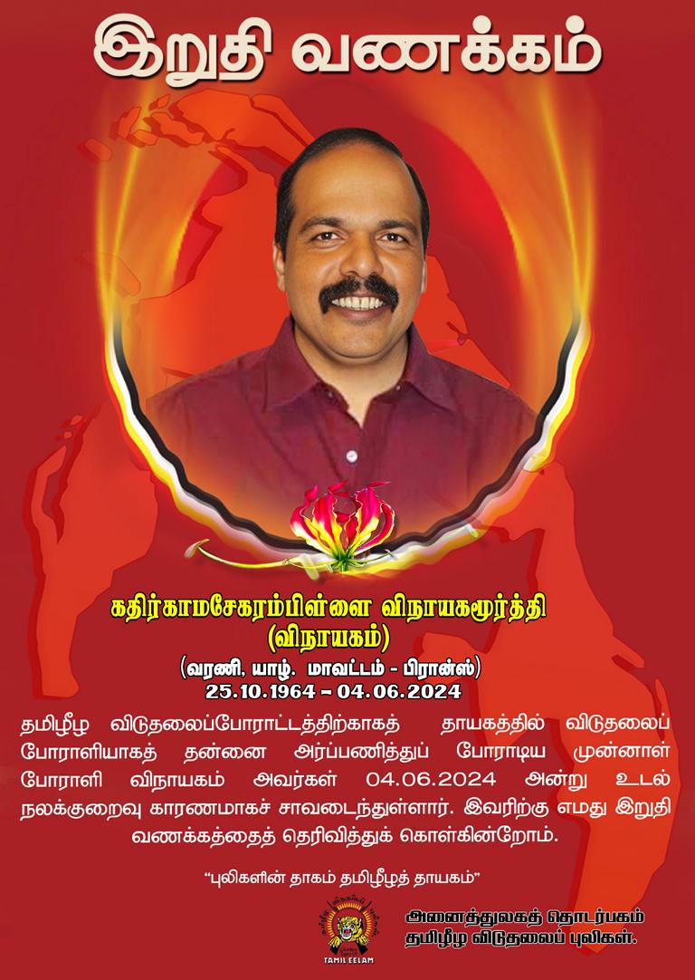 புலம்பெயர் தேசங்களில் முக்கிய செய்திகள் கதிர்காமசேகரம்பிள்ளை விநாயகமூர்த்தி ( விநாயகம்) அவர்களுக்கு இறுதிவணக்கம்-அனைத்துலகத் தொடர்பகம். Posted on June 19, 2024 at 20:08 by சமர்வீரன் 309 0 கதிர்காமசேகரம்பிள்ளை விநாயகமூர்த்தி ( விநாயகம்) அவர்களுக்கு அனைத்துலகத் தொடர்பகம் இறுதிவணக்கம் செலுத்தியுள்ளது.