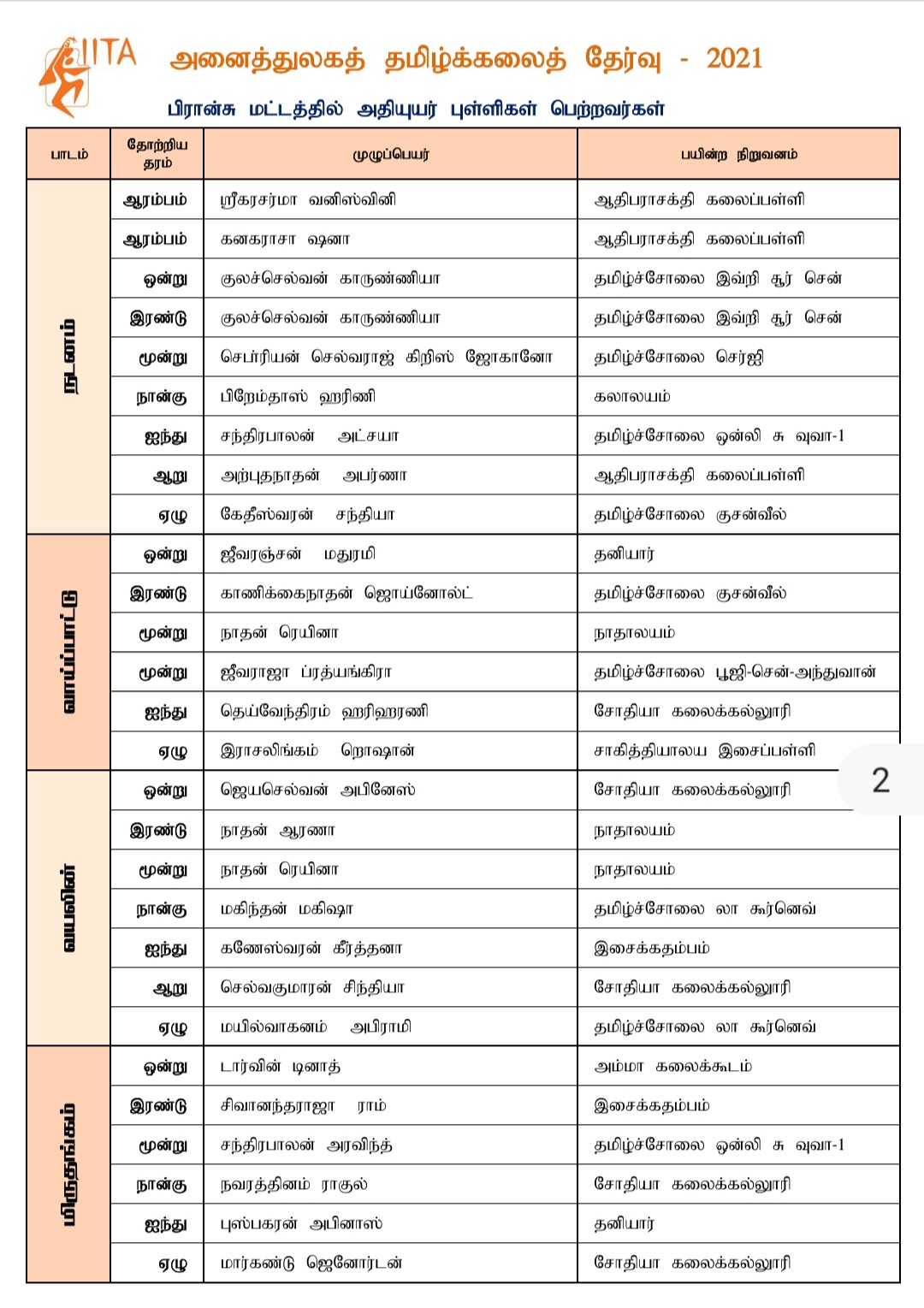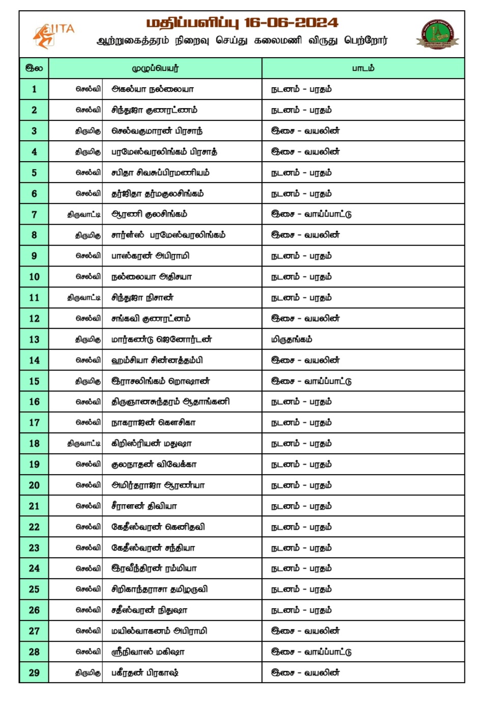 இம்மதிப்பளிப்பில் ஆற்றுகைத் தேர்வு நிறைவு செய்த 29 மாணவர்களுக்குக் கலைமணி விருதுகள் வழங்கப்பட்டன. அத்தோடு அனைத்துலகத் தமிழ்க்கலை நிறுவகம்-தமிழ்ச்சோலைத் தலைமைப் பணியகத்தோடு இணைந்து 25, 20, 10 ஆண்டுகால பணிநிறைவு செய்துள்ள தமிழ்க்கலை ஆசிரியர்களுக்கான மதிப்பளிப்பும், 2019, 2021, 2022 ஆகிய ஆண்டுகளில் தமிழ்க்கலைத் தேர்வில் பிரான்சு மட்டத்தில் அதிகூடிய புள்ளிகளைப் பெற்ற மாணவர்களுக்கான மதிப்பளிப்பும் இடம்பெற்றன.