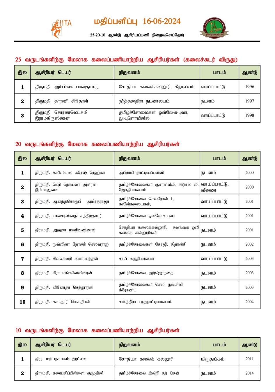 அனைத்துலகத் தமிழ்க்கலை நிறுவகம் தமிழ்ச்சோலைத் தலைமைப் பணியகத்துடன் இணைந்து கடந்த 25 ஆண்டுகளுக்கு மேலாக கலைப்பணியாற்றிவரும் மூன்று ஆசிரியர்கள் ‘’கலைச்சுடர்’’ விருது வழங்கி மதிப்பளிக்கப்பட்டனர்.