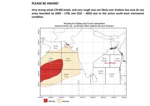 தென்மேற்கு பருவமழை நிலை காரணமாக அரபிக் கடல் பகுதியில் மணிக்கு 80 கிலோ மீற்றர் வேகத்தில் பலத்த காற்று வீசக்கூடும் எனவும், கடல் கொந்தளிப்பாகவும் இருக்கும் இயற்கை அபாயங்கள் முன்னெச்சரிக்கை மையம் தெரிவித்துள்ளது.