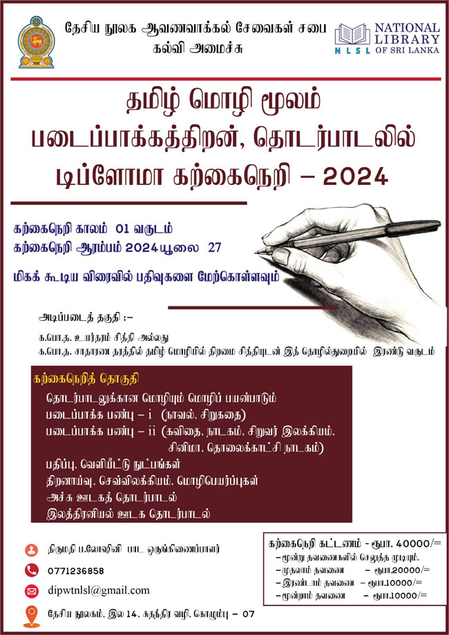 தமிழ் மொழி மூலம் ஆவணப்படுத்துவதில் ஈடுபட்டுள்ள எழுத்தாளர்கள் மற்றும் ஆவணப்படுத்தலில் நுழைய விரும்பும் புதிய படைப்பாளர்களுக்காக, தேசிய நூலக ஆவணவாக்கல் சேவைகள் சபையால் அறிமுகம் செய்யப்பட்ட எழுத்தாளர்கள் மற்றும் படைப்பாளர்களுக்கான படைப்பாக்கத்திறன், தொடர்பாடலில் டிப்ளோமா கற்கைநெறி 2024 ஜூலை மாதம் 27 ஆம் திகதி ஆரம்பிக்கப்படவுள்ளது.