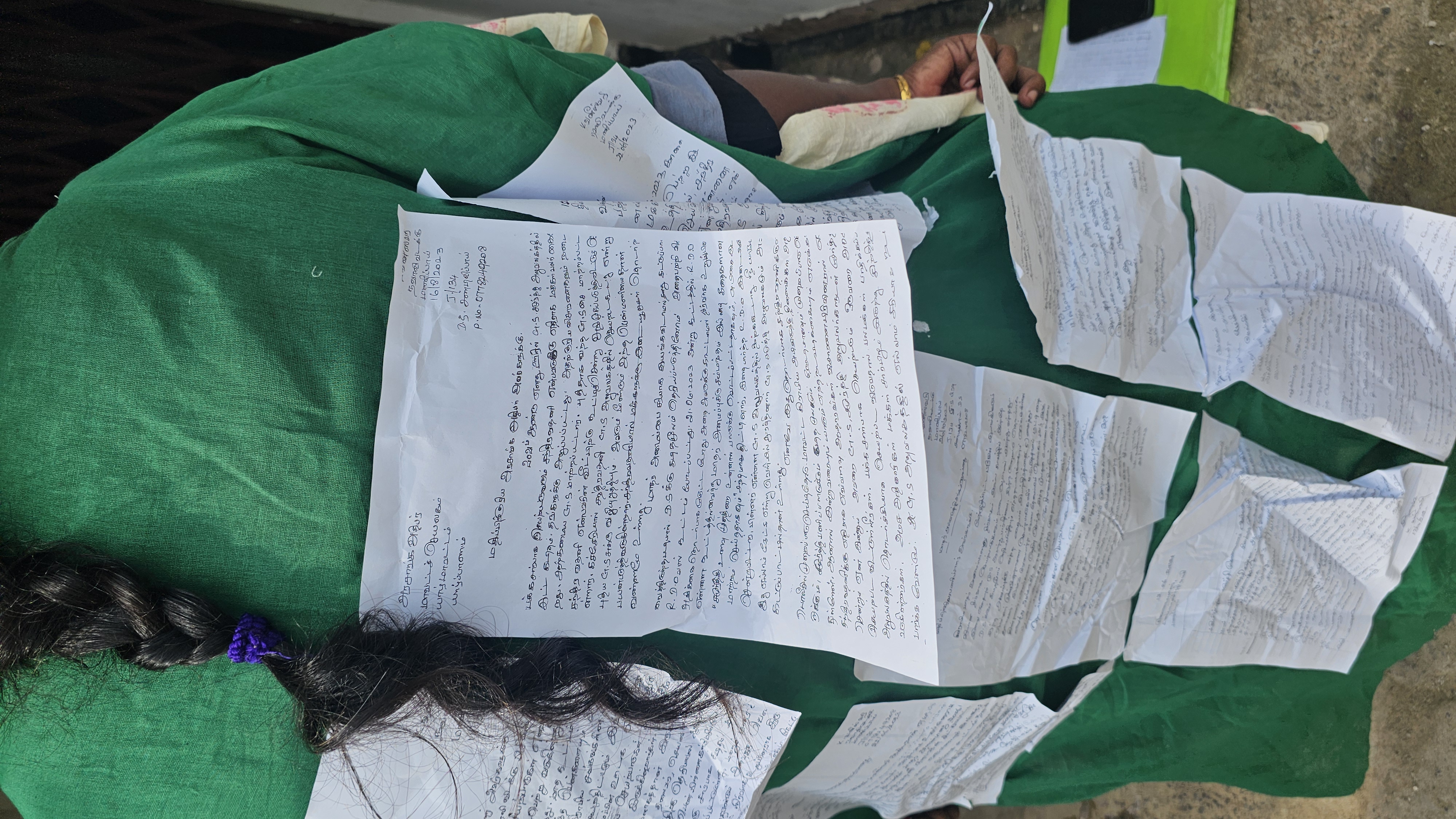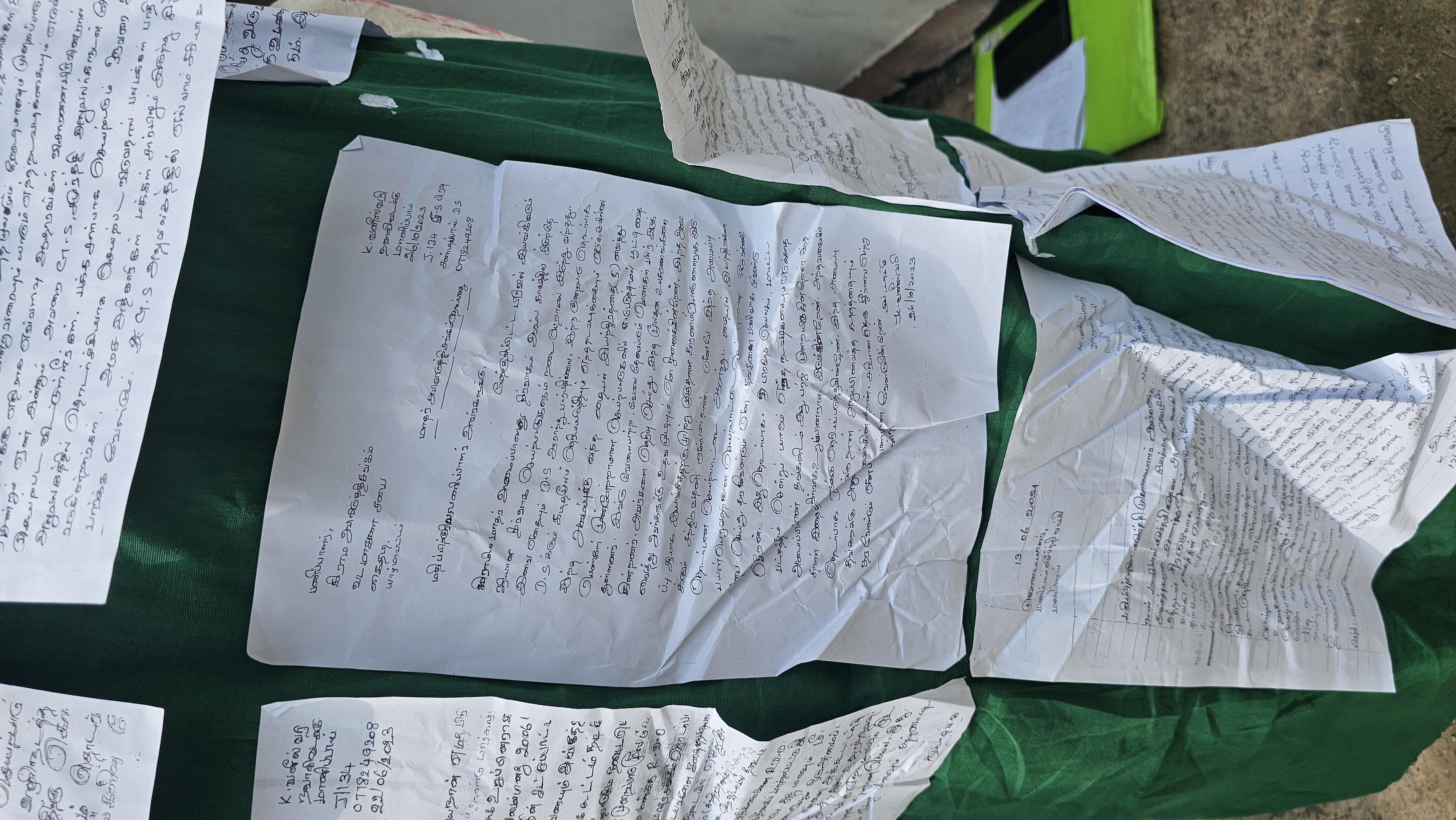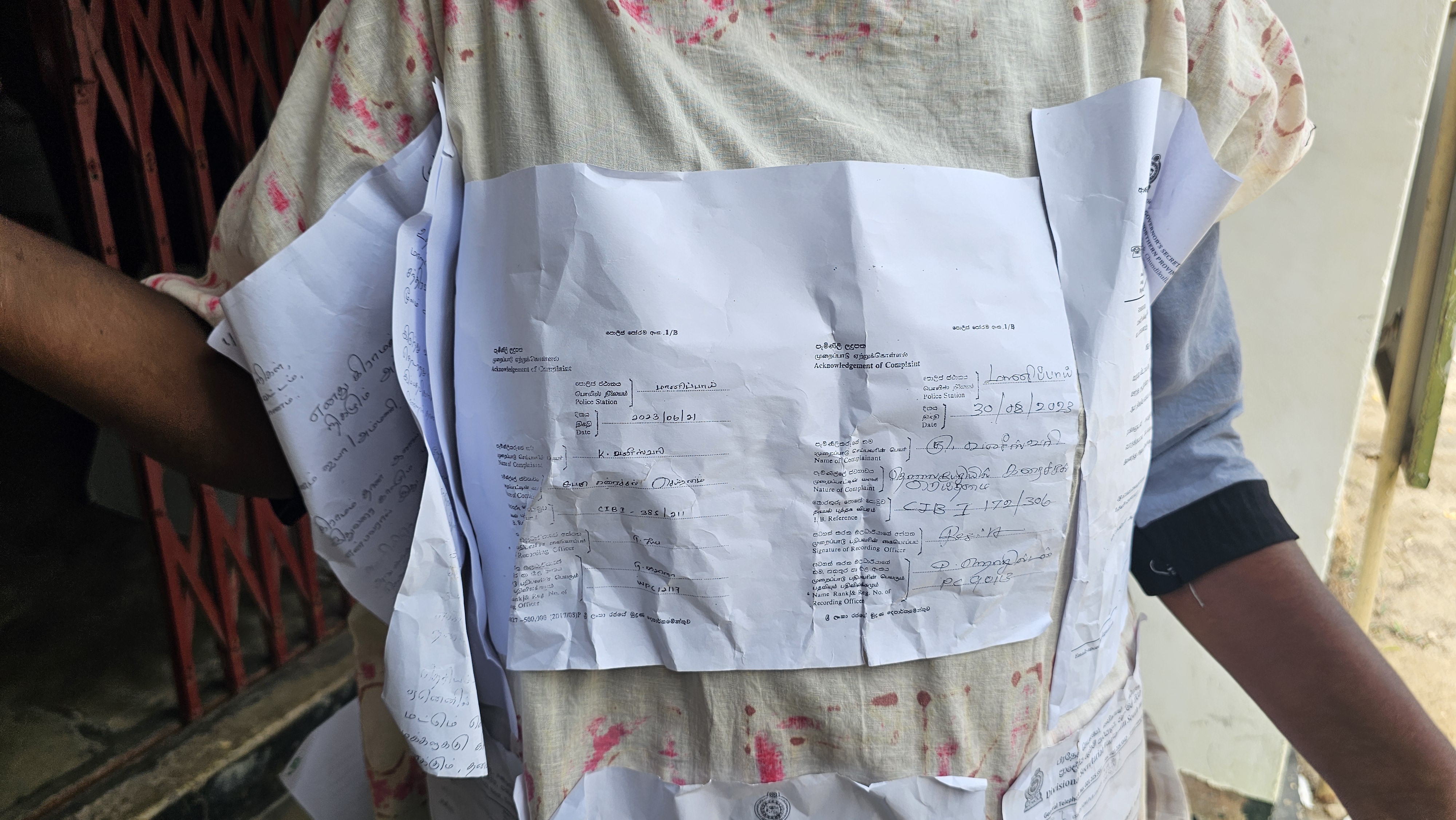 போராட்டத்தில் ஈடுபட்ட குறித்த பெண் தான் அனுப்பிய கடிதங்கள், தனக்கு கிடைத்த கடிதங்களை ஆடையில் தொங்கவிட்ட நிலையில் போராட்டத்தில் ஈடுபட்டார்.