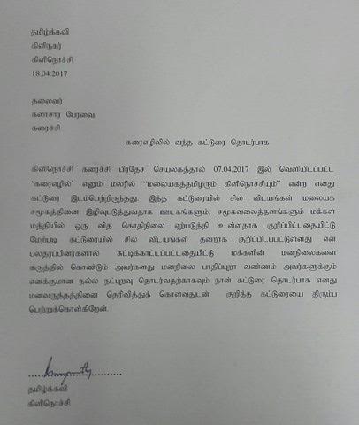 07-04-2017 கரைச்சி கலாசார விழாவில் வெளியிடப்பட்ட கரை எழில் நூலில் மலையகத் தழிழரும் கிளிநொச்சியும் எனும் கட்டுரையில் சில விடயங்கள் மலையக சமூகத்தை இழிவுப்படுத்துவதாக ஊடகங்களும் சமூக வலைத்தளங்களும் மக்கள் மத்தியில் ஒரு வித கொதி நிலை ஏற்படுத்தியுள்ளதாக குறிப்பிட்டதையிட்டு மேற்படி கட்டுரையில் ஒரு சில விடயங்கள் தவறாக குறிப்பிடப்பட்டுள்ளது என பல தரப்பினர்களாலும் சுட்டிக்காட்டப்பட்டதையிட்டு மக்களின் மனநிலைகளை கருத்தில் கொண்டு அவர்களது மனநிலைகள் பாதிப்புறா வண்ணம் அவர்களுக்கும் எனக்குமான நல்ல நட்புறவு தொடர்வதற்காகவும் நான் கட்டுரை தொடர்பாக எனது மனவருத்ததினை தெரிவித்துக்கொள்வதுடன்இகுறித்த கட்டுரையை திரும்ப பெற்றுக்கொள்கிறேன் எனக்குறிப்பிட்டுள்ளார்.
