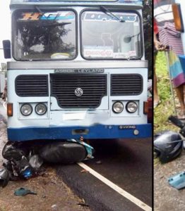 தனியார் பஸ் ஒன்று எதிர்த்திசையில் பயணித்த மோட்டார் சைக்கிளுடன் நேருக்கு நேர் மோதியதில் இந்த விபத்து இடம்பெற்றுள்ளது.
