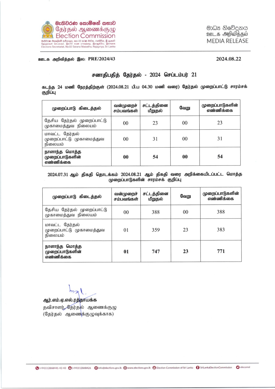 அதன்படி, தேர்தல் சட்டங்களை மீறியமை தொடர்பில் தேசிய தேர்தல் முறைப்பாட்டு முகாமைத்துவ நிலையத்திற்கு 388 முறைப்பாடுகளும், மாவட்ட தேர்தல் முறைப்பாட்டு முகாமைத்துவ நிலையத்திற்கு 359 முறைப்பாடுகளும் கிடைக்கப்பெற்றுள்ளன.