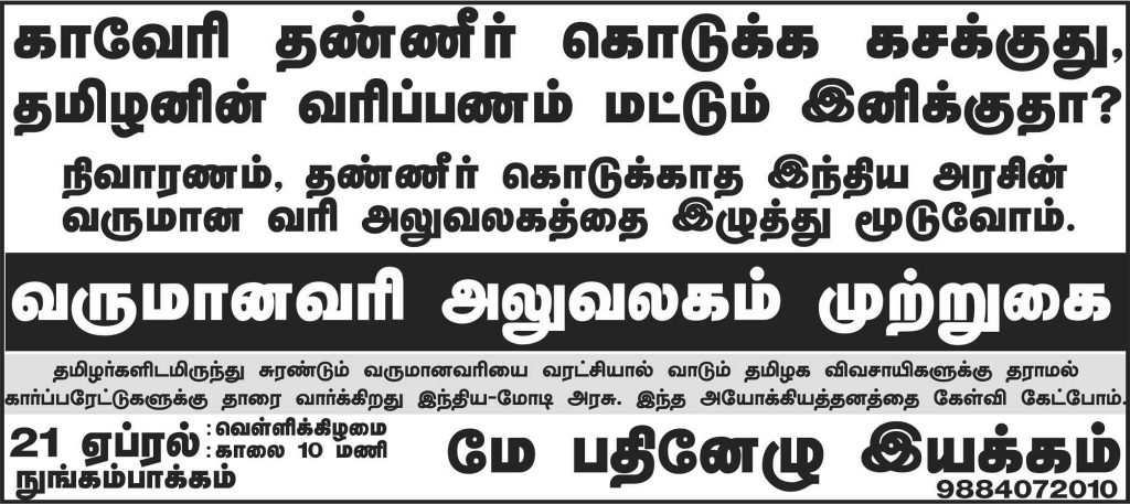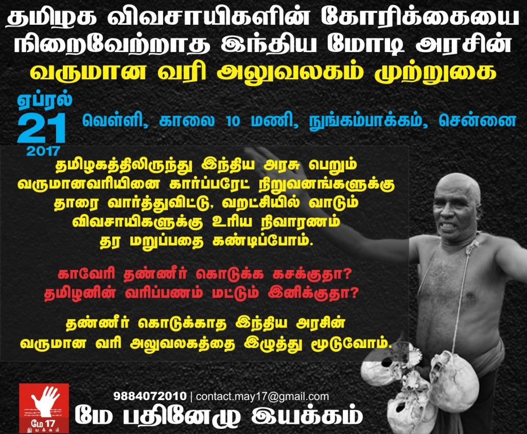 மத்திய அரசின் இந்த துரோகத்தை கண்டித்து வெள்ளிகிழமை 21-4-2017 காலை 10 மணிக்கு மே 17 இயக்கத்தின் சார்பாக சென்னை நுங்கப்பாக்கத்திலுள்ள மத்திய அரசின் வருமனா வரித்துறை அலுவலகத்தை முற்றுகையிடுகிறோம்.
