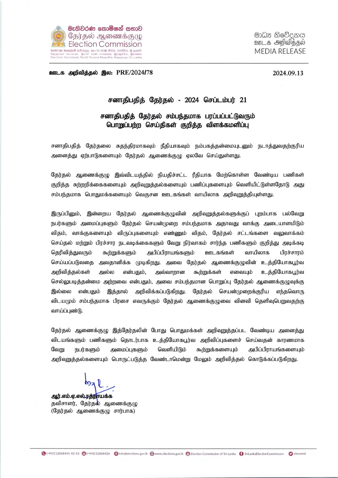 தேர்தல் ஆணைக்குழுவினால் தேர்தல் தொடர்பான அனைத்து விடயங்களும் பணிகளும் உத்தியோகபூர்வமாக பொதுமக்களுக்கு அறிவிக்கப்படுவதால் வேறு நபர்களோ அமைப்புகளோ வெளியிடும் கூற்றுக்களையும் அபிப்பிராயங்களையும் அறிவுறுத்தல்களையும் பொருட்படுத்த வேண்டாமென இந்த அறிக்கையில் மேலும் குறிப்பிடப்பட்டுள்ளது.