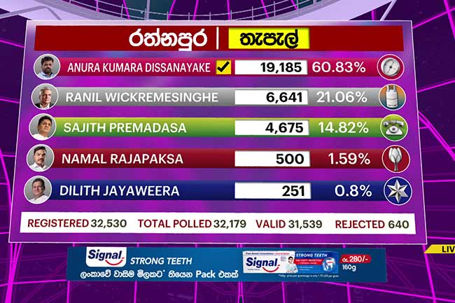 இரத்தினபுரி மாவட்டத்திற்கான தபால் மூல வாக்கெடுப்பு முடிவுகளின் அடிப்படையில்,