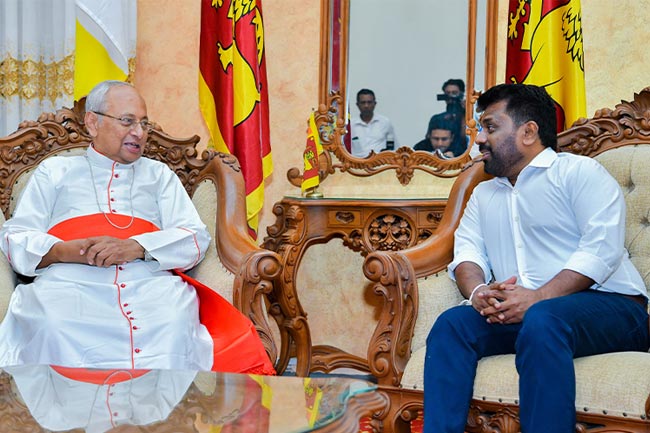 புதிய ஜனாதிபதி அநுர குமார திசாநாயக்க நேற்று (23) கொழும்பு பேராயர் கர்தினால் மெல்கம் ரஞ்சித் ஆண்டகையைச் சந்தித்து ஆசி பெற்றார். பொரளை பேராயரின் உத்தியோகபூர்வ இல்லத்திற்கு விஜயம் செய்த ஜனாதிபதி, பேராயரைச் சந்தித்து நலம் விசாரித்ததுடன் சிறிது நேரம் உரையாடலில் ஈடுபட்டார்.