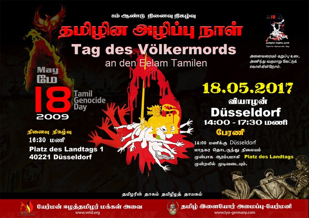எத்தனை தடைகள் விதிக்கப்பட்டாலும் எத்தனை வருடங்கள் கடந்து சென்றாலும் இந்த நெருப்பை எவராலும் அணைத்து விடமுடியாது.தமிழின அழிப்பை, முள்ளிவாய்க்கால் படுகொலையை நினைவுகூருவது மட்டும் அல்ல நடைபெற்ற தமிழின அழிப்புக்கு நீதி கோரி தொடர்ந்தும் போராடுவோம். மே 18 அன்று நீதி கோரும் மாபெரும் பேரணி Düsseldorf நகரில் நடைபெறும் சமையத்தில் , தமிழின அழிப்பு வாரத்தை முன்னிட்டு 10 .05 .2017 அன்று முதல் 18 .5 .2017 வரை யேர்மன் நாட்டின் மேற்பிராந்தியத்தில் இருந்து தலைநகர் வரை தமிழின அழிப்பு கண்காட்சியை மையப்படுத்தி விழிப்புணர்வு ஊர்த்தி சுற்றுப்பயணம் மேற்கொள்ளப்படஉள்ளது. இவ் விழிப்புணர்வு ஊர்த்தி சுற்றுப்பயணனத்தில் ஊடறுக்கும் முக்கிய நகரமத்தியில் தமிழின அழிப்பு கண்காட்சி வைக்கப்பட்டு அங்கு உள்ள நகரபிதாக்களுடன் சந்திப்புகள் மேற்கொள்ளப்பட்டு அத்தோடு நடைபெறவிருக்கும் மாபெரும் பேரணிக்கு தமிழ் மக்களை அழைக்கும் முகமாக மக்கள் சந்திப்புகளும் நடைபெறும். நகரங்கள் வாரியான மேலதிகமான தகவல்கள் விரைவில் அறிவிக்கப்படும்.இப் பயணத்தில் 9 நாட்கள் இணைந்து அரசியற்செயற்பாட்டில் ஈடுபட விரும்புவர்கள் கீழ் குறிப்பிட்ட அமைப்புகளுடன் தொடர்புகொள்ளவும்.