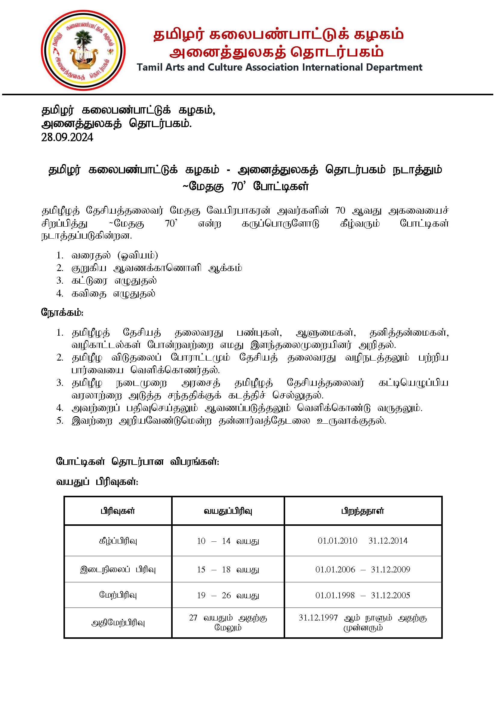 தமிழர் கலைபண்பாட்டுக் கழகம் – அனைத்துலகத் தொடர்பகம் தமிழீழத் தேசியத்தலைவரது 70 ஆவது அகவைநாளை முன்னிட்டுநடாத்தும் மேதகு 70 போட்டிகள்.