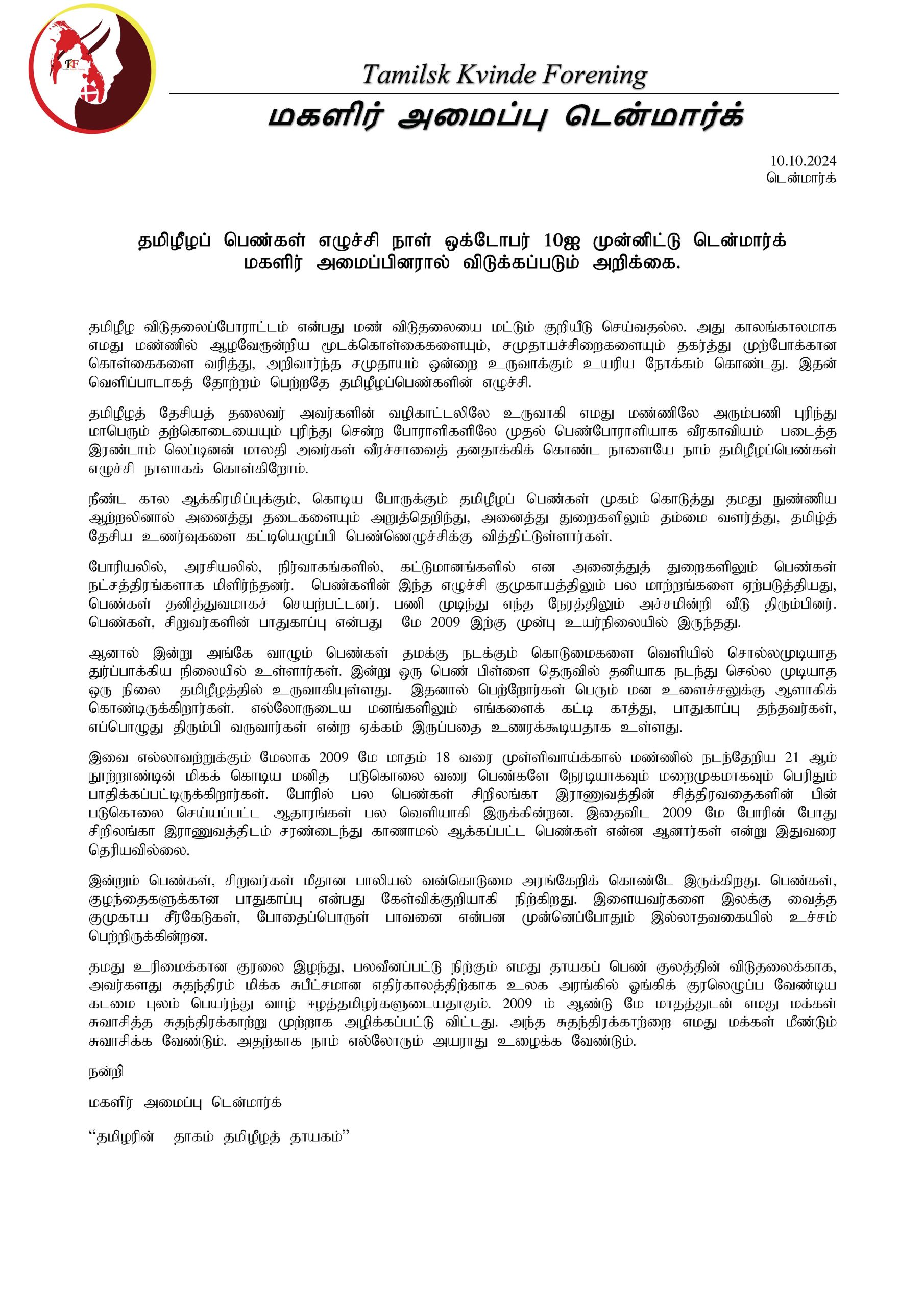 தமிழீழப் பெண்கள் எழுச்சி நாள் ஒக்டோபர் 10ஐ முன்னிட்டு டென்மார்க்
