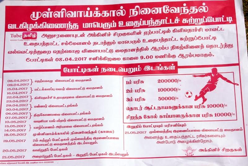 அக்கினிச் சிறகுகள் அமைப்பின் ஏற்பாட்டில் கிளிநொச்சி உதைப்பந்தாட்ட சம்மேளனத்தின் தலைமையில் வடக்கு கிழக்கு இணைந்த மாபெரும் உதைப்பந்தாட்டச் சுற்றுப்போட்டியாக வடக்கில் கிழக்கில் உள்ள பல மாவட்டங்களில் ஆரம்பிக்கப்பட்டுள்ளது.