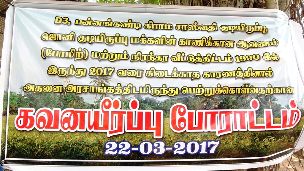 கிளிநொச்சி பன்னங்கண்டி சரஸ்வதி கமம் மற்றும் ஜொனிக் குடியிருப்பு பிரதேச மக்கள் தமது குடியிருப்பு காணிக்கான ஆவணம் மற்றும் அடிப்படை வசதிகள் நிரந்தர வீட்டுத் திட்டம் என்பன இதுவரை கிடைக்கவில்லைஎனவே இவளவு காலமும் அடிப்படை உரிமை இல்லாத மக்களாக வாழ்ந்து விட்டோம் இனியும் வாழ முடியாது தயவு செய்து எமக்கான காணி உரிமத்தினை வழங்குங்கள் எனக் கோரி ஆரம்பிக்கப்பட்ட போராட்டம் இன்று செவ்வாய்க்கிழமை முப்பத்தி ஐந்தாவது நாளாக தொடர்கிறது