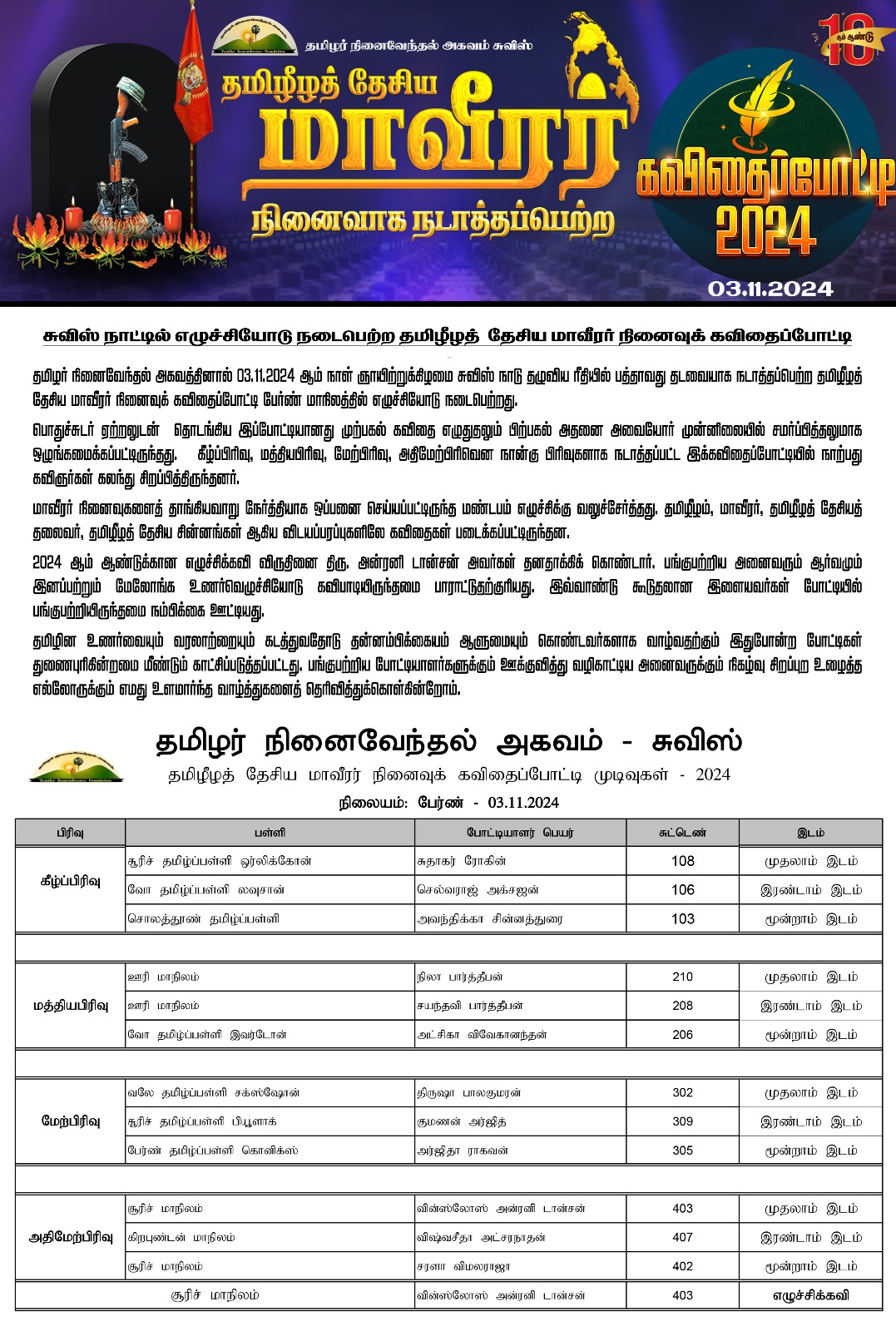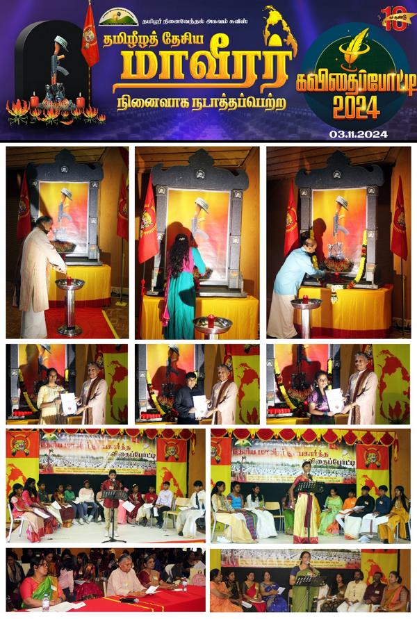 சுவிஸ் நாட்டில் எழுச்சியோடு நடைபெற்ற தமிழீழத் தேசிய மாவீரர் நினைவுக் கவிதைப்போட்டிதமிழர் நினைவேந்தல் அகவத்தினால் 03.11.2024 ஆம் நாள் ஞாயிற்றுக்கிழமை சுவிஸ் நாடு தழுவிய ரீதியில் பத்தாவது தடவையாக நடாத்தப்பெற்ற தமிழீழத் தேசிய மாவீரர் நினைவுக் கவிதைப்போட்டி பேர்ண் மாநிலத்தில் எழுச்சியோடு நடைபெற்றது.