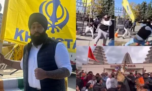 “கனடாவின் பிராம்டன் நகரில் அமைந்துள்ள ஹிந்து மகாசபை கோவிலுக்கு வந்த பக்தர்கள் மீது காலிஸ்தான் ஆதரவாளர்கள் தாக்குதல் நடத்திய சம்பவம் அங்கு பரபரப்பை ஏற்படுத்தியது. பிராம்டனில் உள்ள ஹிந்து மகா சபை கோவிலுக்கு வந்த பக்தர்கள் மீது அங்கு கூடிய காலிஸ்தான் ஆதரவாளர்கள் சிலர் குச்சியால் தாக்னர். காலிஸ்தான் கொடியுடன் அவர்கள் பக்தர்களைத் தாக்கும் வீடியோ இணையத்தில் வெளியானது.