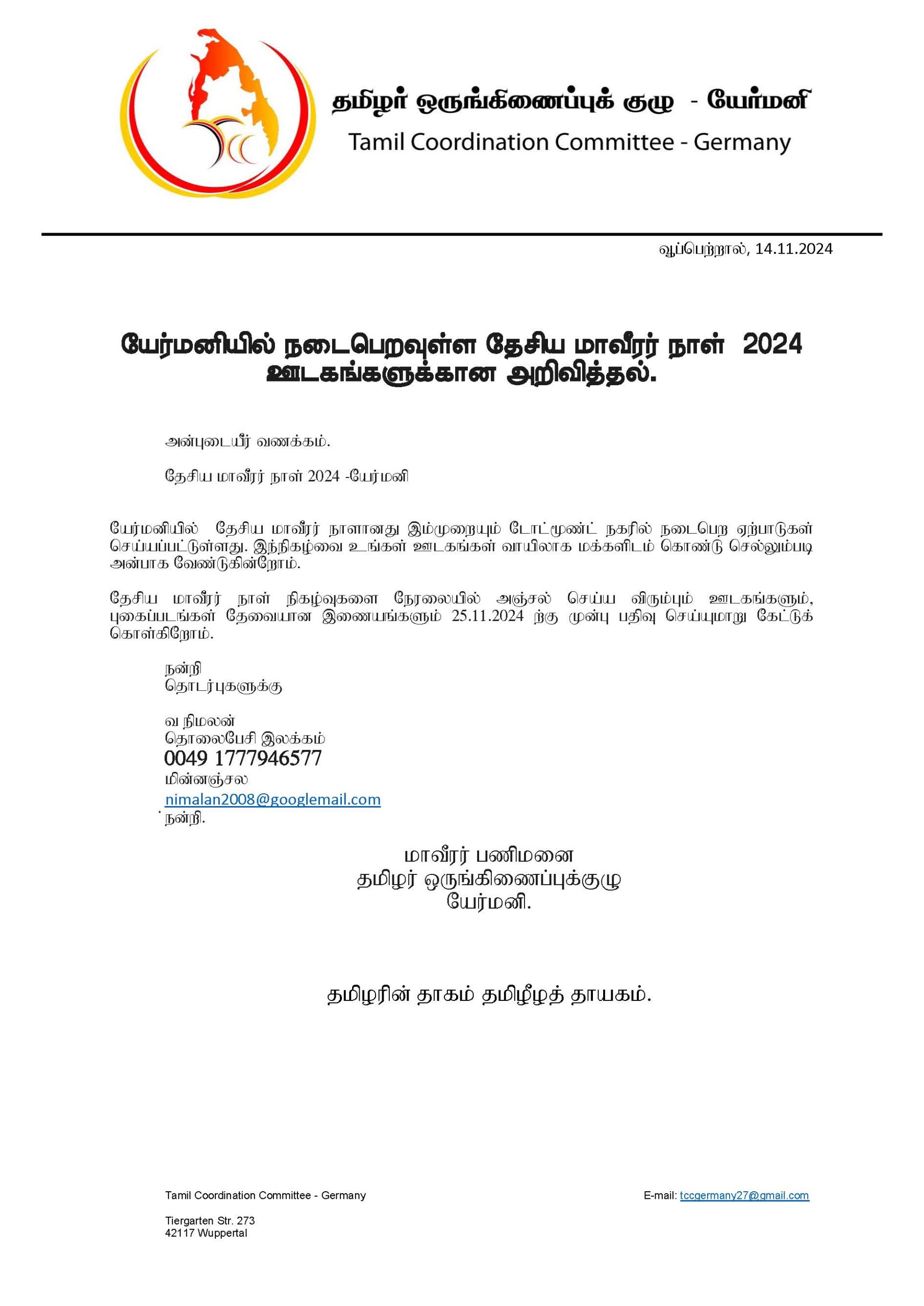 யேர்மனியில் தேசிய மாவீரர் நாளானது இம்முறையும் டோட்மூண்ட் நகரில் நடைபெற ஏற்பாடுகள் செய்யப்பட்டுள்ளது. இந்நிகழ்வை உங்கள் ஊடகங்கள் வாயிலாக மக்களிடம் கொண்டு செல்லும்படி அன்பாக வேண்டுகின்றோம்