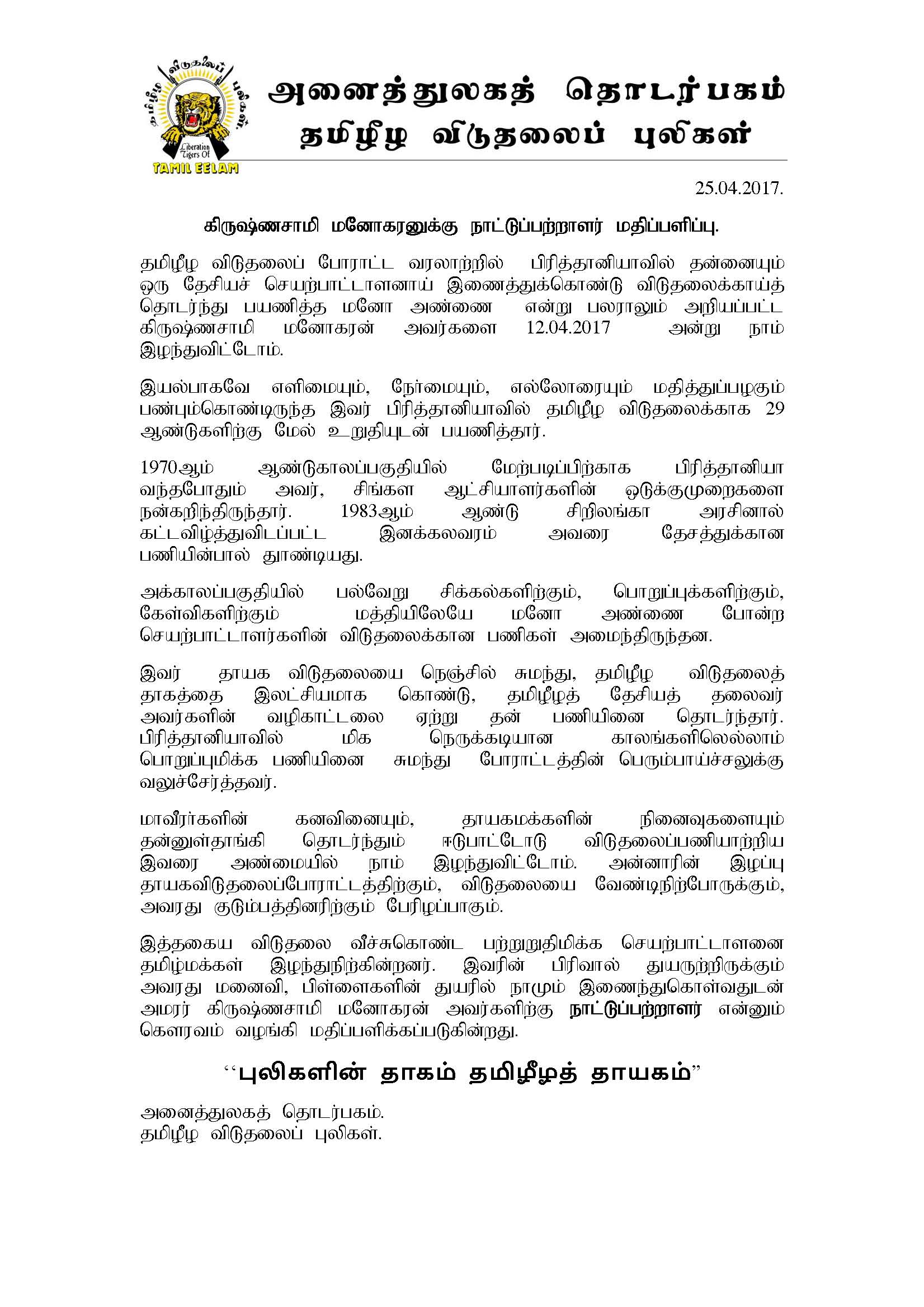 தமிழீழ விடுதலைப் போராட்ட வரலாற்றில் பிரித்தானியாவில் தன்னையும் ஒரு தேசியச் செயற்பாட்டாளனாய் இணைத்துக்கொண்டு விடுதலைக்காய்த் தொடர்ந்து பயணித்த மனோ அண்ணை என்று பலராலும் அறியப்பட்ட கிருஷ்ணசாமி மனோகரன் அவர்களை 12.04.2017 அன்று நாம் இழந்துவிட்டோம்.