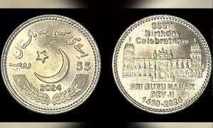 சீக்கிய மதத்தைத் தோற்றுவித்தவரான குருநானக் தேவின் 555-வது பிறந்த நாளை கடந்த நவம்பர் 15 ஆம் தேதி உலகம் முழுவதும் உள்ள சீக்கியர்கள் மிகவும் சிறப்பாகக் கொண்டாடினர்.இந்நிலையில், குருநானக்கின் 555வது பிறந்தநாளை முன்னிட்டு சிறப்பு நினைவு நாணயத்தை பாகிஸ்தான் அரசு வெளியிட்டுள்ளது.