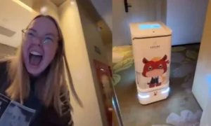 அறையின் கதவுக்கு பின்னால் அவருக்கு ஆச்சரியம் காத்திருந்துள்ளது. கதவை திறந்து பார்த்தால் அட்டைபெட்டி வடிவில் இடுப்பளவு உயரம் கொண்ட ரோபோ ஒன்று நின்று கொண்டு உணவு டெலிவரி செய்தது. ‘சீனாவில் எப்படி உணவு டெலிவரி செய்யப்படுகிறது’ என்ற தலைப்புடன் சமூக வலைத்தளத்தில் வெளியான இந்த வீடியோ 1½ லட்சம் லைக்குகளை பெற்று வைரலாகி வருகிறது.