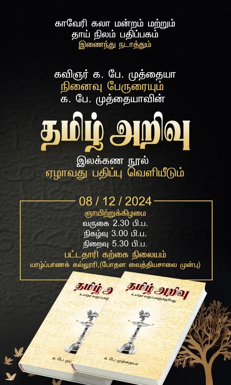 காவேரி கலாமன்றம் மற்றும் தாய்நிலம் பதிப்பகம் இணைந்து நடத்தும் கவிஞர் க. பே. முத்தையா எழுதிய “தமிழ் அறிவு” நூல் வெளியீட்டு நிகழ்வு நாளை ஞாயிற்றுக்கிழமை பிற்பகல் 3 மணியளவில் பட்டதாரி கற்கை நிலையம் – யாழ்ப்பாணக் கல்லூரியில் (யாழ். போதனா மருத்துவமனை முன்பாக) பேராசிரியர் எஸ். சண்முகதாஸ் தலைமையில் நடைபெறவுள்ளது.