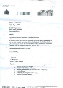 யாழ். பல்கலைக்கழகத்தின் துணைவேந்தராக தற்போதைய விஞ்ஞான பீடாதிபதி பேராசிரியர் விக்னேஸ்வரன் ஜனாதிபதியால் நியமிக்கப்பட்டிருப்பதாக ஜனாதிபதி செயலகம் அறிவித்துள்ளது.