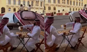 அப்போது அதே காரில் மறுபக்கமாக இருந்த 2 பேர் தங்களுடைய உடலை வெளியே நீட்டி டீ கோப்பைகளை உயர்த்தி காட்டியவாறு செல்கிறார்கள். இதுதொடர்பான வீடியோ சமூக வலைத்தளத்தில் வெளியாகி 7½ கோடிக்கும் அதிகமான பார்வைகளையும், 20 லட்சம் ‘லைக்’குகளை குவித்து காட்டுத்தீப்போல பரவி வருகிறது.