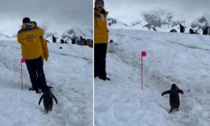 அங்கே பெங்குயின் ஒன்று அந்த வழியாக கடந்து செல்ல முயன்றது. அப்போது காதலர்களின் நெருக்கத்தை தொந்தரவு செய்ய தயங்கி அமைதியாக காத்திருந்தது. இதனை வீடியோவாக பதிவு செய்து கொண்டிருந்த புகைப்பட கலைஞர், பெங்குயின் குறித்து அந்த ஜோடியிடம் கூறினார்.