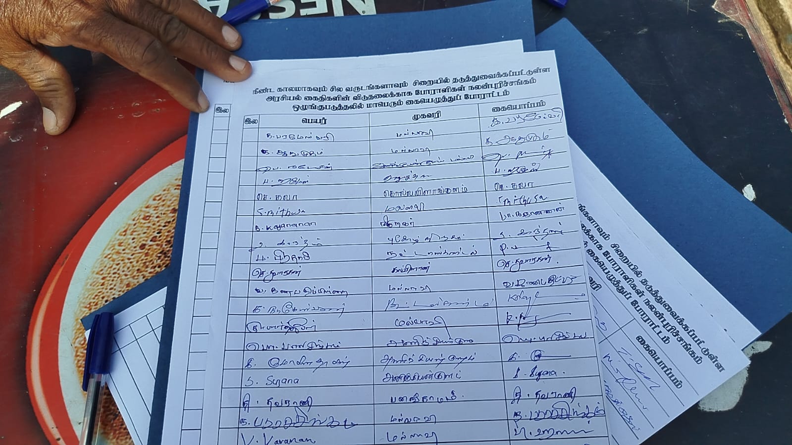 நீண்டகாலமாக சிறையில் தடுத்து வைக்கப்பட்டுள்ள அரசியல் கைதிகளின் விடுதலையை வலியுறுத்தி சேகரிக்கப்படும் குறித்த கையெழுத்துக்கள் சேகரிக்கப்பட்டு மகஜராக ஜனாதிபதி அவர்களிடம் கையளிக்கப்படவுள்ளது குறிப்பிடத்தக்கது.