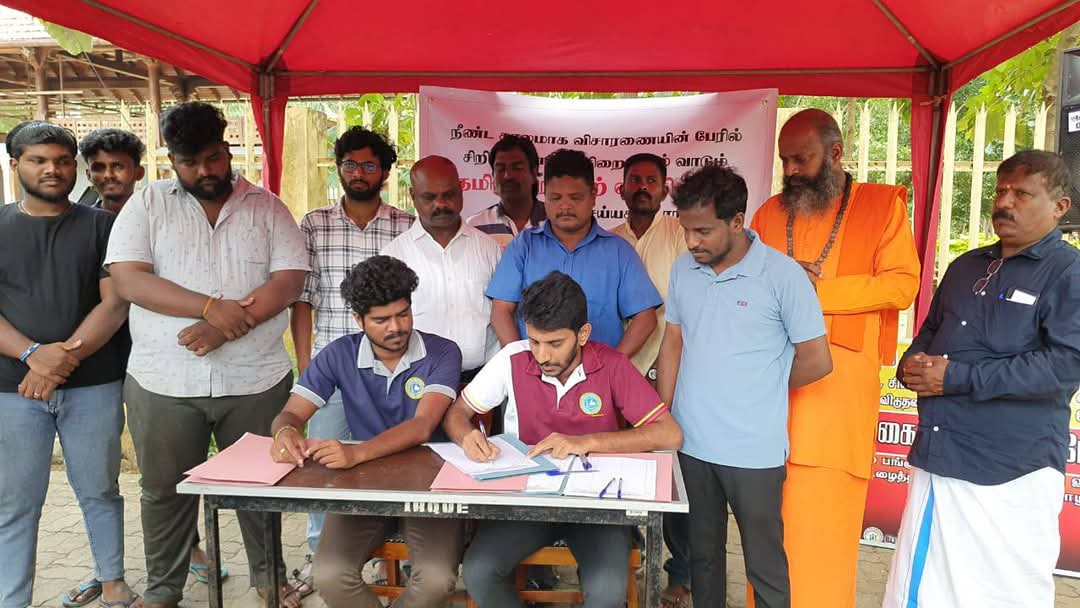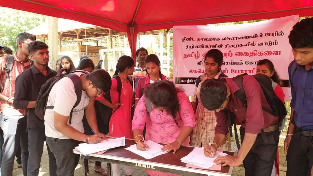 நீண்டகாலமாக விசாரணையின் பேரில் சிறிலங்காவின் சிறைகளில் தமிழ் போர் கைதிகளை விடுதலை செய்யக் கோரி வடக்கு – கிழக்குத் தழுவி முன்னெடுக்கப்படும் கையெழுத்துப் போராட்டத்திற்கு வலுச் சேர்க்கும் வகையில் யாழ்ப்பாணப் பல்கலைக்கழக மாணவர் ஒன்றியத்தின் ஒருங்கிணைப்பில் இன்று (06.01.2024) யாழ் பல்கலைக்கழக முன்றலில் கையெழுத்துப் போராட்டம் முன்னெடுக்கப்பட்டது.