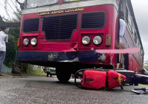 கவனக்குறைவாக செலுத்தப்பட்ட மோட்டார் சைக்கிள் ஒன்று இலங்கை போக்குவரத்துச் சபைக்கு சொந்தமான பஸ் ஒன்றுடன் மோதியதில் இந்த விபத்து இடம்பெற்றுள்ளது.