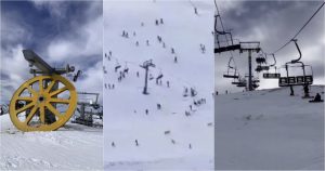 ஒரு கப்பி செயலிழந்ததால் ஒரு கேபிள் தளர்ந்து சில நாற்காலிகள் தரையில் விழுந்து, பனிச்சறுக்கு வீரர்களை கீழே பனியில் வீசியது.