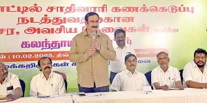 தமிழகத்தில் சாதிவாரி கணக்கெடுப்பு நடத்துவதற்கான அவசர, அவசிய தேவைகள் குறித்த கலந்தாய்வு கூட்டம், சென்னை தியாகராய நகரில் உள்ள ஒரு ஓட்டலில் நேற்று நடைபெற்றது. பாமகவின் வழக்கறிஞர்கள் சமூகநீதி பேரவை சார்பில் நடத்தப்பட்ட இந்த கூட்டத்துக்கு பாமக தலைவர் அன்புமணி தலைமை தாங்கினார்.