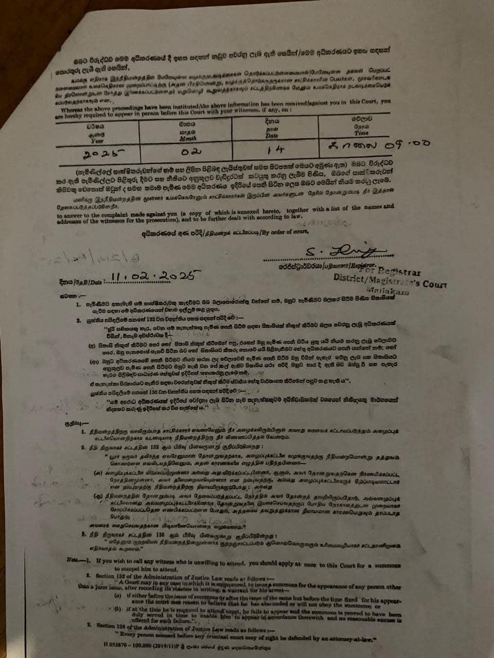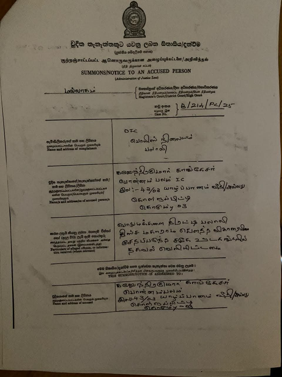 தையிட்டி போராட்டம் தொடர்பில், சமூக வலைத்தளங்களில் பரப்பப்பட்ட அநாமதேய துண்டுபிரசுரம் தொடர்பில் தமிழ் தேசிய மக்கள் முன்னணியின் தலைவர் கஜேந்திரகுமார் பொன்னம்பலத்திற்கு நீதிமன்றம் அழைப்பாணை விடுத்துள்ளது.