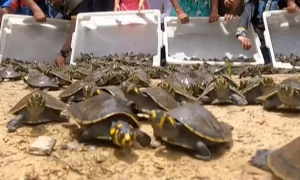 தென் அமெரிக்க நாடான பிரேசிலில் உள்ள டிராஜாகாஸ் என அழைக்கப்படும் மஞ்சள் புள்ளி ஆமைகள் அருகி வரும் உயிரினமாக உள்ளது. குறிப்பாக கடற்கரையில் அவையிடும் முட்டையை மற்ற விலங்குகள், பறவை உள்ளிட்ட உயிரினங்கள் நாசப்படுத்தி விடுகின்றன. எனவே அதனை பாதுகாக்க அரசாங்கம் பல்வேறு நடவடிக்கை எடுத்து வருகிறது.அந்தவகையில் அங்குள்ள இகாபோ ஆசு ஆற்றங்கரையோரம் சுமார் 5 ஆயிரம் டிராஜாகாஸ் ஆமை குஞ்சுகள் சுற்றித்திரிந்தன. அவற்றை வனத்துறை போலீசார் பத்திரமாக மீட்டு ஆற்றில் கொண்டு விட்டனர்.