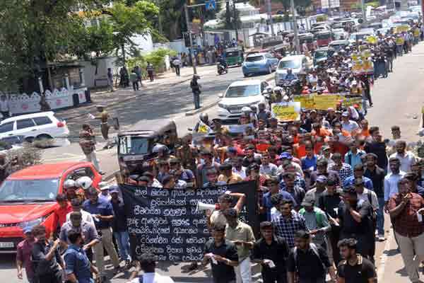 “இலவசக் கல்வியில் இருந்து உருவான சுகாதார அறிவியல் பட்டதாரிகளின் எண்ணிக்கையைக் கட்டுப்படுத்தி, பட்டப்படிப்பு கடைகளில் இருந்து அரசாங்க சேவைக்குப் பட்டதாரிகளைச் சேர்க்கும் தேர்வு சதிகளை உடனடியாக நிறுத்து” என்ற தொனிப்பொருளில் பேராதனை பல்கலைக்கழகத்தின் இணை சுகாதார அறிவியல் பீட மாணவர் சங்கம் திங்கட்கிழமை (24) அன்று சுகாதார அமைச்சுக்கு முன்பாக ஆர்ப்பாட்டம் நடத்தியது.