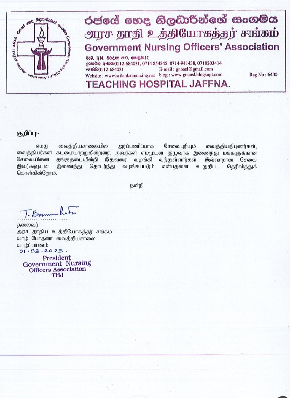 5. மிகக் குறுகிய காலத்தில் அங்கு கடமை புரியும் வைத்தியர் ஒருவருக்கும் பொறுப்புத் தாதிக்கும் ஏற்பட்ட சிறிய கருத்து முரண்பாட்டின் பின்னணியில் இந்த அசாதாரண சூழ்நிலை தோன்றியுள்ளது. இது சம்பந்தமாக ஆரம்பகட்ட விசாரணைகள் முடிவடையும் தறுவாயில் இருப்பதுடன் சுகாதார அமைச்சின் முறையான விசாரணைக்கு இவ்விடயம் உட்படுத்தப்பட்டுள்ளது. விசாரணை முடிவடையும் பட்சத்தில் அனைவரும் ஏற்றுக்கொள்ளக்கூடிய தீர்வொன்றினைப் பெற்றுக்கொள்ள முடியும் என நாம் கருதுகின்றோம். நியாயமான