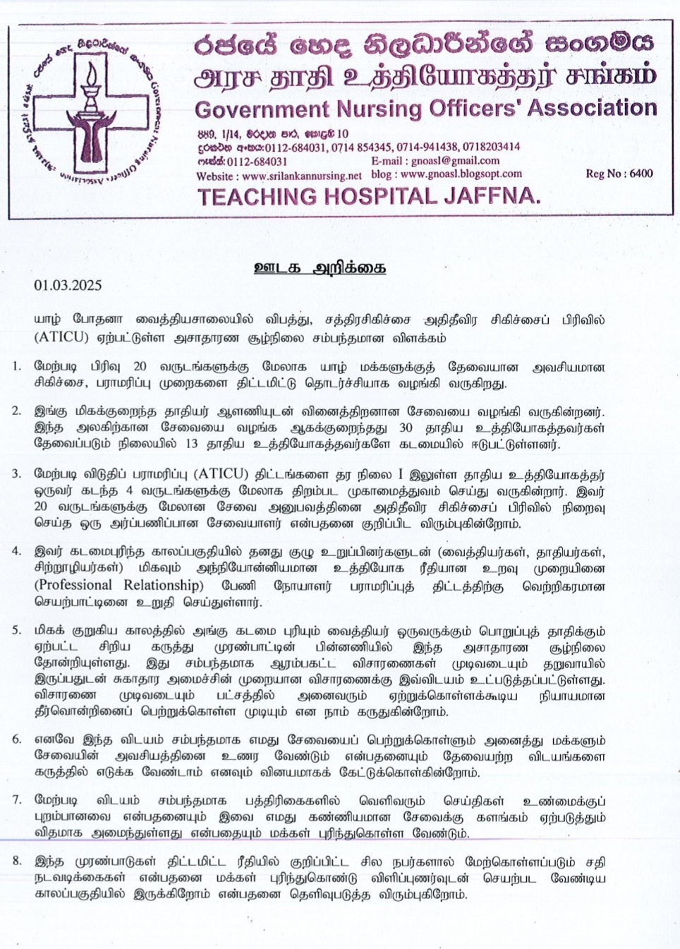 யாழ். போதனா வைத்தியசாலையில் விபத்து, சத்திரசிகிச்சை அதிதீவிர சிகிச்சைப் பிரிவில் (ATICU) ஏற்பட்டுள்ள அசாதாரண சூழ்நிலை சம்பந்தமான விளக்க ஊடக அறிக்கை ஒன்றினை யாழ்ப்பாணம் போதனா வைத்தியசாலையின் தாதியர் சங்கம் வெளியிட்டுள்ளது.