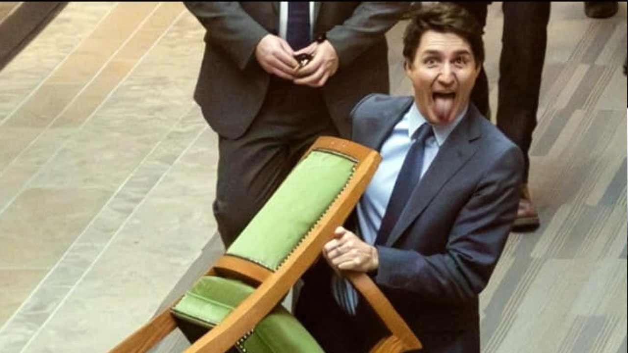 ட்ரூடோ தனது நாக்கை வெளியே நீட்டிக்கொண்டு கையில் நாற்காலியுடன் இருக்கும் அந்தப் புகைப்பட்டம் சமூக ஊடகங்களில் வைரலாகியுள்ளது.