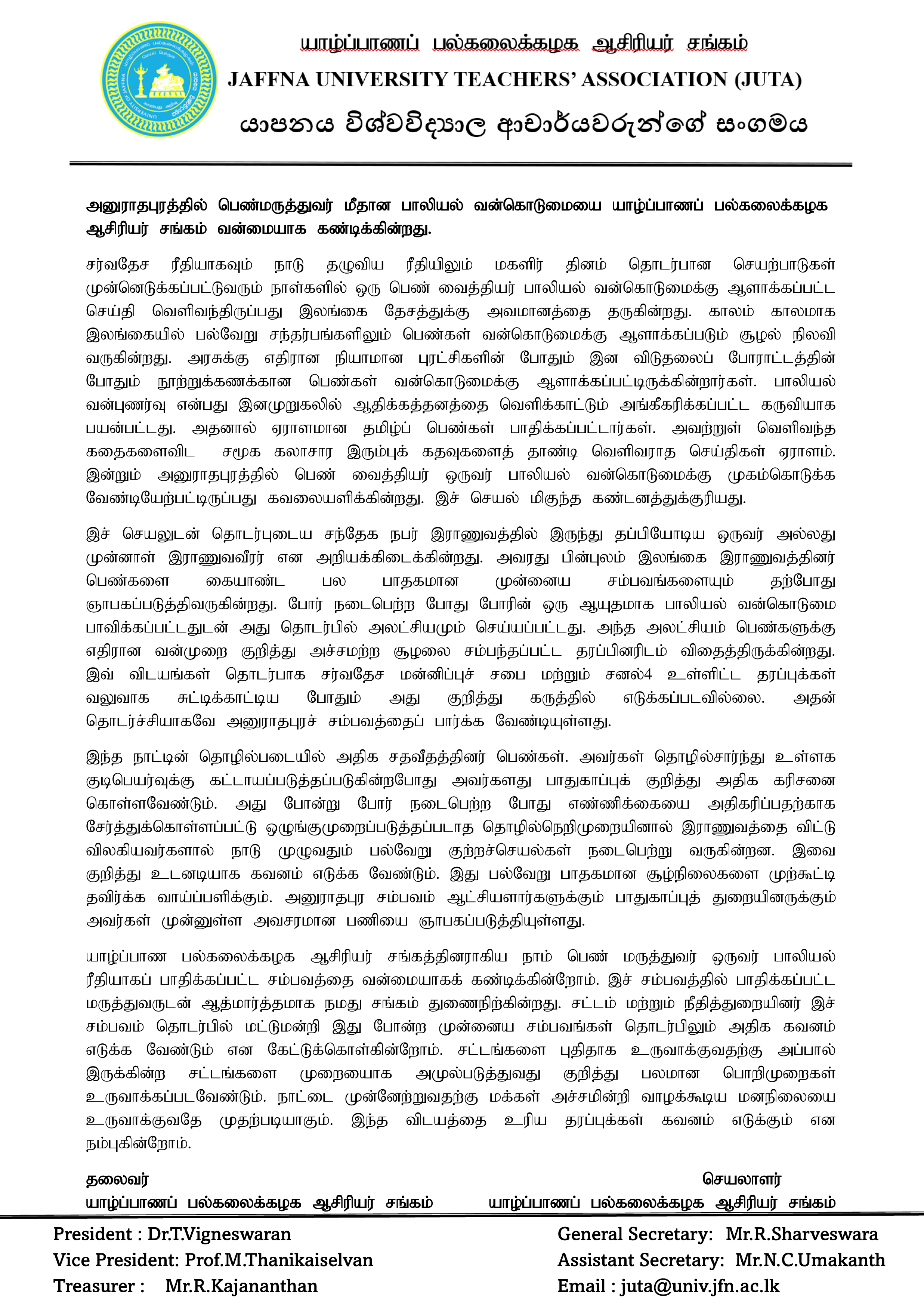 யாழ்ப்பாண பல்கலைக்கழக ஆசிரியர் சங்கத்தினராகிய நாம் பெண் மருத்துவர் ஒருவர் பாலியல் ரீதியாகப் பாதிக்கப்பட்ட சம்பவத்தை வன்மையாகக் கண்டிக்கின்றோம். இச் சம்பவத்தில் பாதிக்கப்பட்ட மருத்துவருடன் ஆத்மார்த்தமாக நமது சங்கம் துணை நிற்கின்றது. சட்டம் மற்றும் நீதித்துறையினர் இச் சம்பவம் தொடர்பில் மட்டுமன்றி இது போன்ற முன்னைய சம்பவங்கள் தொடர்பிலும் அதிக கவனம் எடுக்க வேண்டும் என கேட்டுக்கொள்கின்றோம். சட்டங்களை புதிதாக உருவாக்குவதற்கு அப்பால் இருக்கின்ற சட்டங்களை முறையாக அமுல்படுத்துவது குறித்து பலமான பொறிமுறைகள் உருவாக்கப்படவேண்டும். நாட்டை முன்னேற்றுவதற்கு மக்கள் அச்சமின்றி வாழக்கூடிய மனநிலையை உருவாக்குவதே முதல் படியாகும். இந்த விடயத்தை உரிய தரப்புக்கள் கவனம் எடுக்கும் என நம்புகின்றோம் என்றுள்ளது.
