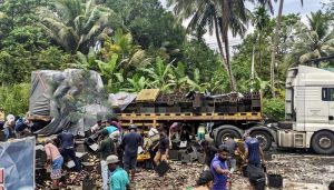 விபத்தின் போது பார ஊர்தியில் ஏற்றிச் செல்லப்பட்ட மதுபான போத்தல்கள் வீதியில் சிதறியுள்ளன.