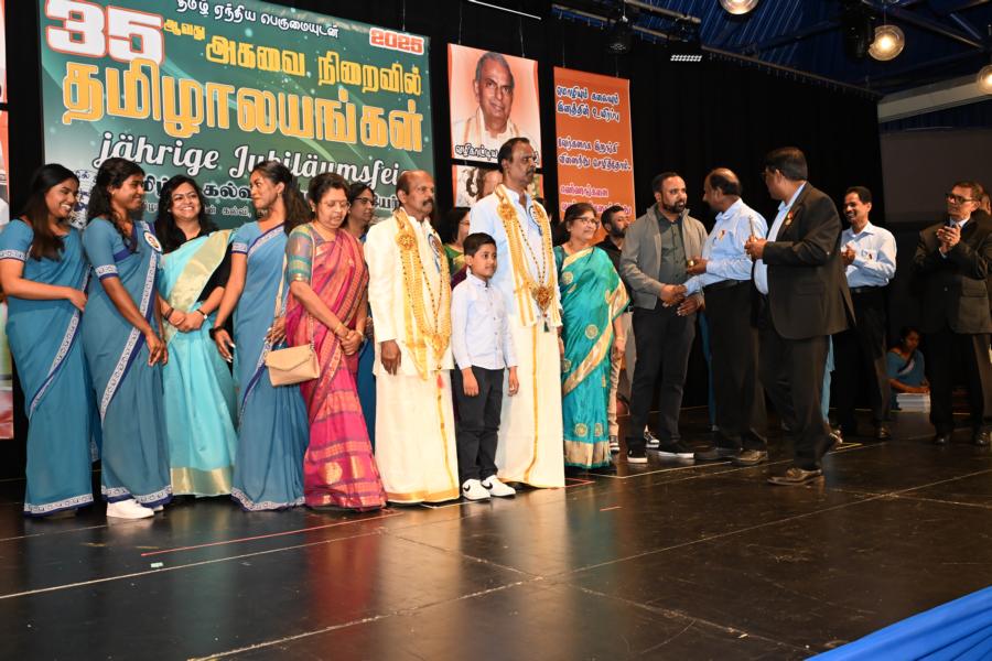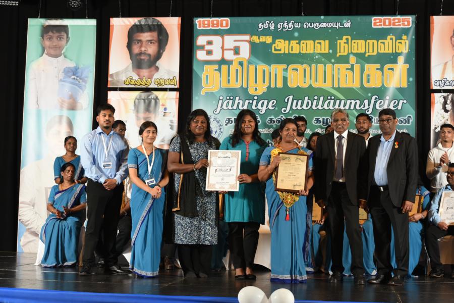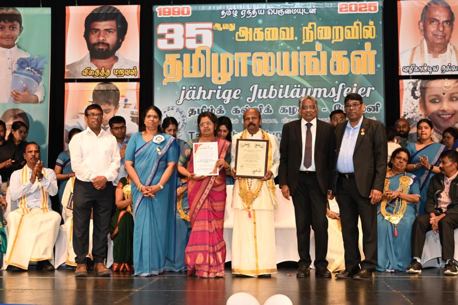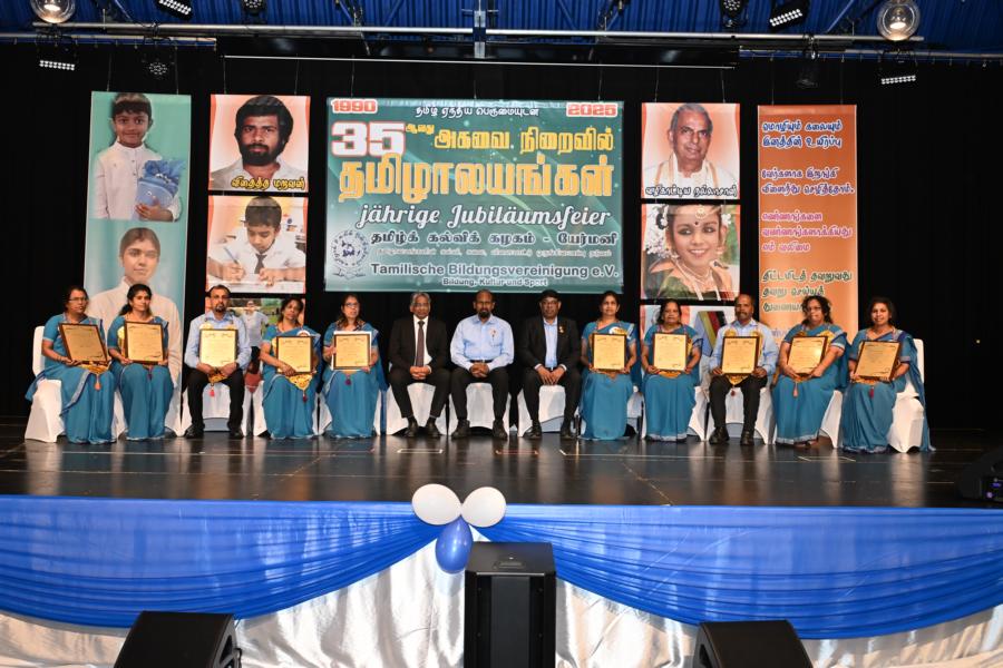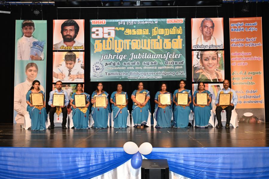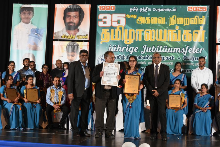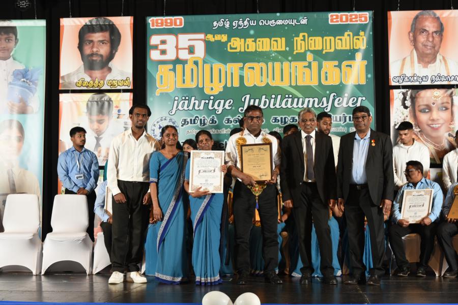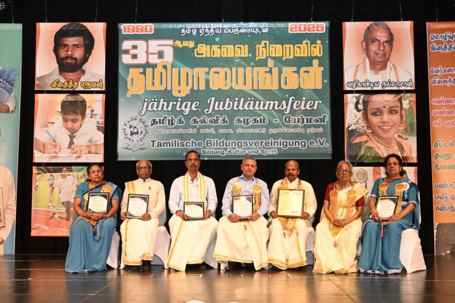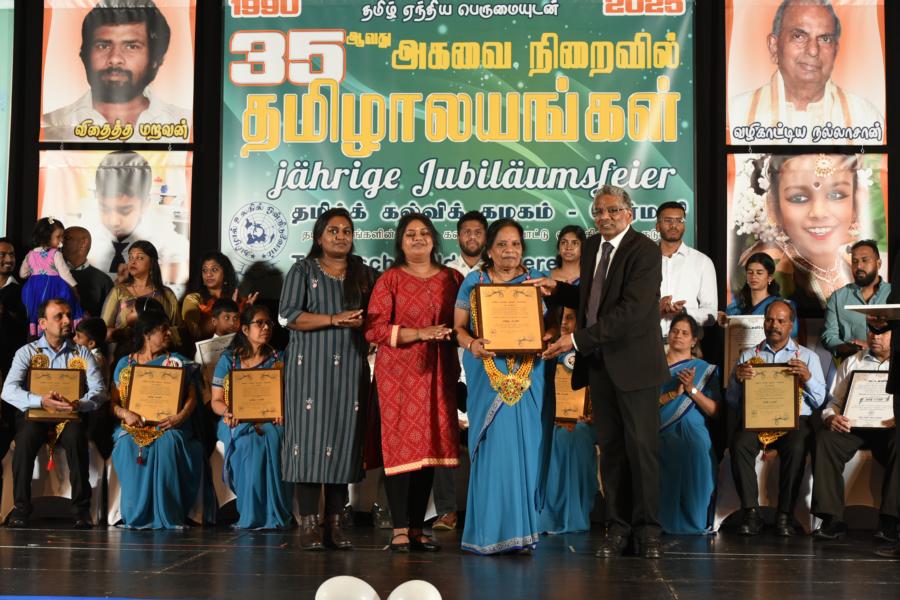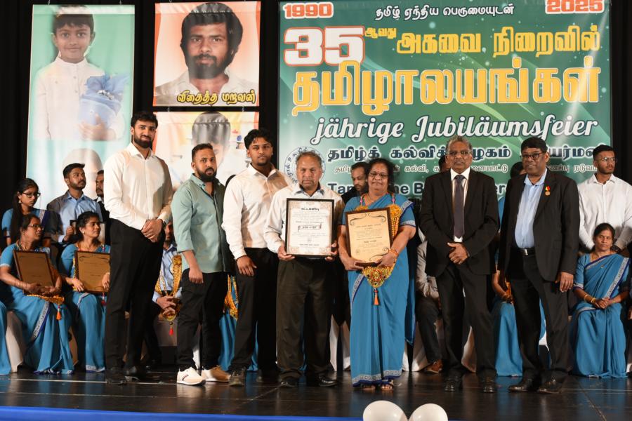 யூச்சன் தமிழாலய நிர்வாகி தமிழ்மாணி திரு. தம்பையா சிவலிங்கம், கிறீபெல்ட் தமிழாலய நிர்வாகி தமிழ்மாணி திருமதி யஸ்ரின் உதயதேவி, கிறீபெல்ட், நெற்றெற்றால், வியர்சன் ஆகிய தமிழாலயங்களின் ஆசிரியர் தமிழ்மாணி திரு. ஆலாலசுந்தரம் ஞானகுமார், வூப்பெற்றால் தமிழாலய ஆசிரியர் தமிழ்மாணி திருமதி தெய்வறஞ்சனி கிருதரமூர்த்தி மற்றும் வூப்பெற்றால் தமிழாலய ஆசிரியர் தமிழ்மாணி திரு. செபஸ்ரியான் றொமாலியஸ் ஸ்ரீபன் ஆகியோருக்கு 30 ஆண்டுகள் பணிநிறைவுக்கான மதிப்பளிப்பும், கைன்ஸ்பேர்க் தமிழாலயத்தின் நிர்வாகியும் ஆசிரியரும் மற்றும் யூச்சன் தமிழாலயத்தின் ஆசிரியருமான தமிழ்மாணி திரு. திசைவீரசிங்கம் புஸ்பராசா அவர்களுக்கு 35 ஆண்டுகள் பணிநிறைவு மதிப்பளிப்பும் வழங்கப்பட்டன.