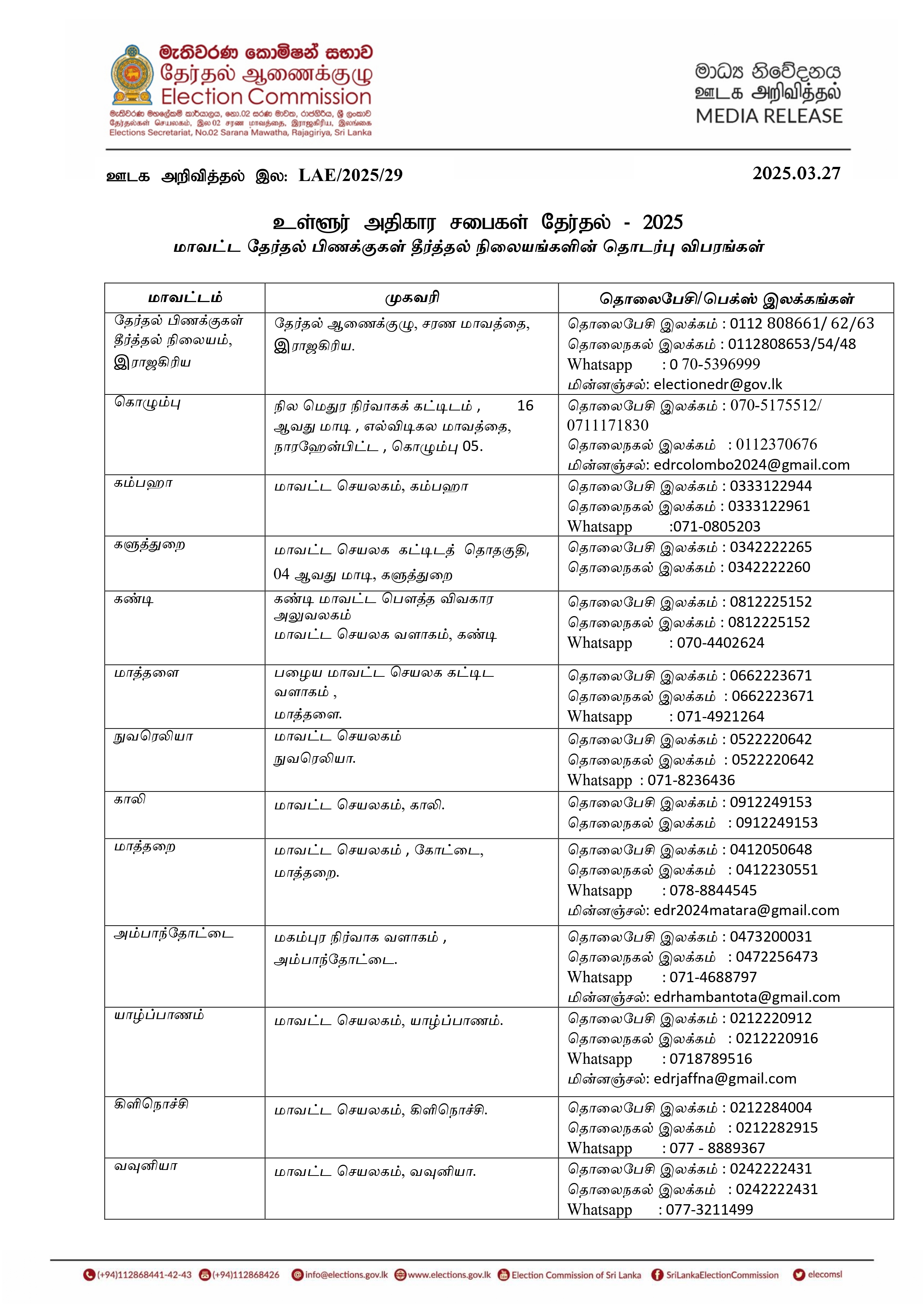 எதிர்வரும் மே மாதம் 06 ஆம் திகதி நடைபெறவுள்ள உள்ளூராட்சி சபைத் தேர்தல் தொடர்பான முறைப்பாடுகளை வழங்குவதற்கு தேர்தல் ஆணைக்குழுவால் மாவட்ட ரீதியாக தொலைபேசி இலக்கங்கள் அறிமுகம் செய்யப்பட்டுள்ளன.