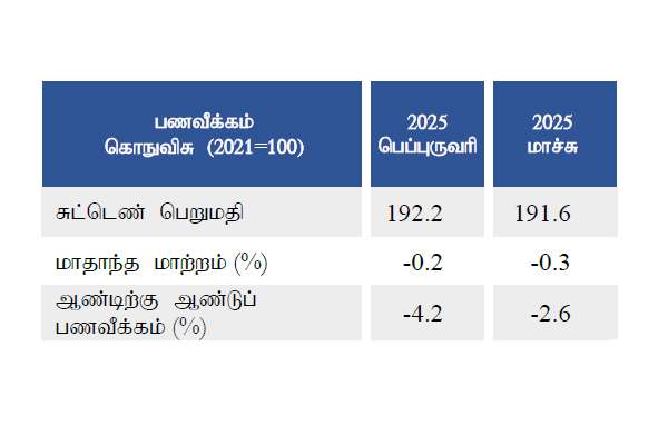 உணவில்லா பணச்சுருக்கம் 2025 பெப்ரவரி மாதத்தில் பதிவாகியிருந்த 6.1 சதவீதம் என்பதிலிருந்து மார்ச் மாதத்தில் 4.1 சதவீதமாக வீழ்ச்சியடைந்திருந்தது. உணவு வகைகளுக்கான பணச்சுருக்கம் 2025 பெப்ரவரி மாதத்தில் 0.2 சதவீதமாக காணப்பட்ட நிலையில், மார்ச் மாதத்தில் 0.6 சதவீத பணவீக்கமாக உயர்ந்திருந்தது