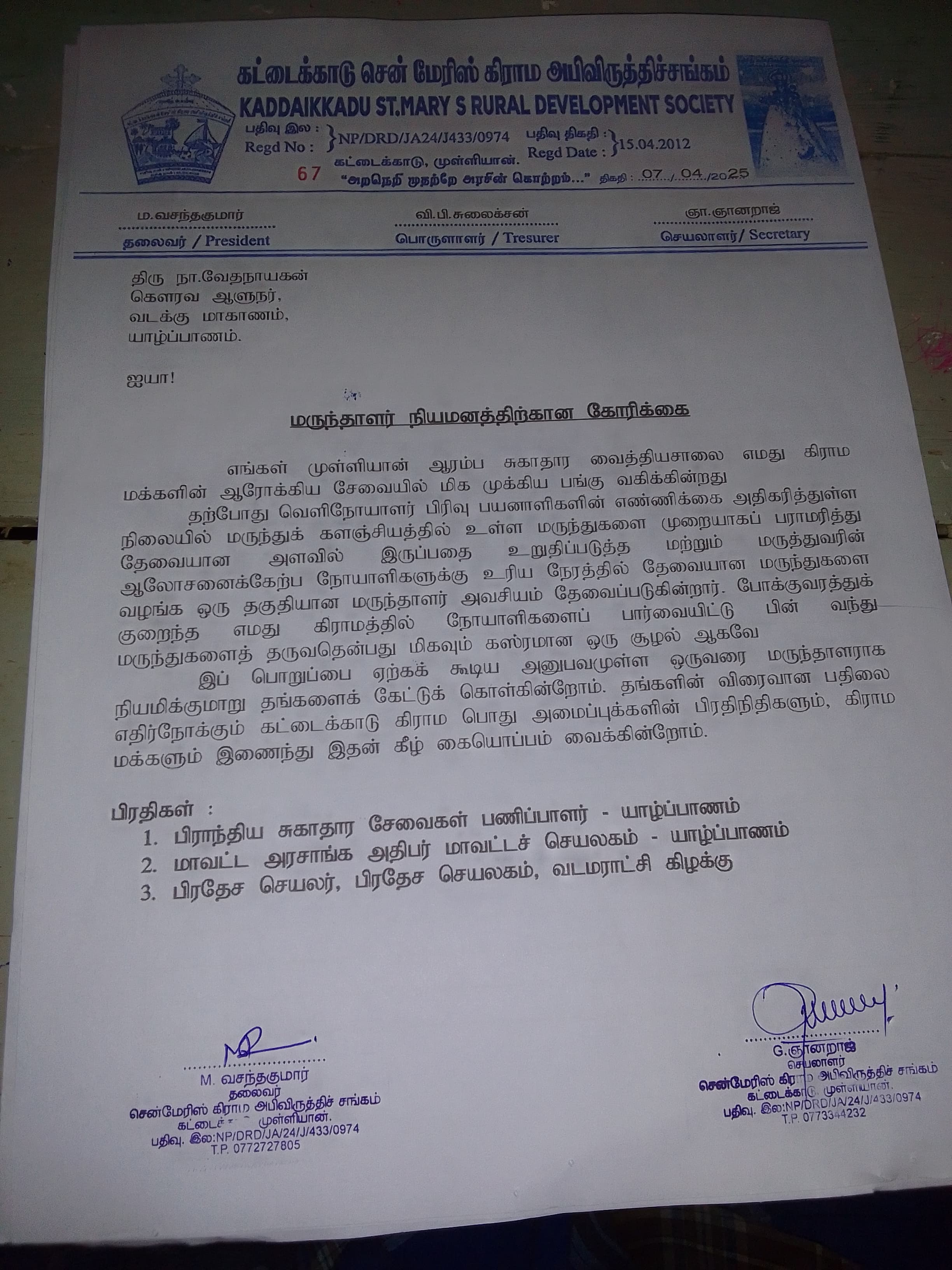 கட்டைக்காடு கிராம அபிவிருத்திச் சங்கத்தினரால் ஆளுநருக்கு கோரிக்கை கடிதம் அனுப்பிவைக்கப்பட்டுள்ளது.
