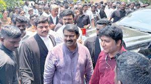 டிஐஜி தொடர்ந்த அவதூறு வழக்கில், திருச்சி நீதிமன்றத்தில் நாம் தமிழர் கட்சியின் தலைமை ஒருங்கிணைப்பாளர் சீமான் நேற்று ஆஜரானார். திருச்சி ஜூடீசியல் மாஜிஸ்திரேட் நீதிமன்றத்தில் (எண்.4) திருச்சி சரக டிஐஜி வருண்குமார் தொடர்ந்த அவதூறு வழக்கில் சீமான் ஆஜராகாமல் இருந்தார். நேற்று முன்தினம் நடைபெற்றவழக்கு விசாரணையின்போதும் சீமான் ஆஜராகாததால், ஏப்.8-ம் தேதி நீதிமன்றத்தில் கட்டாயம் ஆஜராக வேண்டும் என்று நீதிபதி விஜயா உத்தரவிட்டார்.